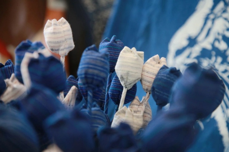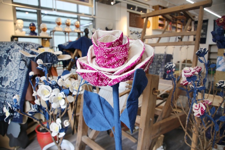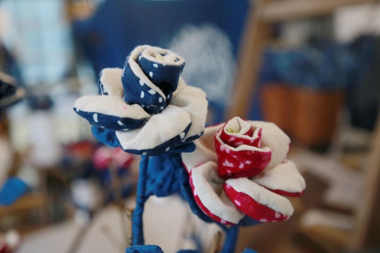 玫瑰、郁金香、谷雨花、银杏叶……一朵朵由药斑布制作的花朵,蓝白相间,素雅清新。凑近花朵,记者被一股香味吸引了。安亭药斑布推广人胡苏芬介绍说,这些花骨朵里填充了中草药,有不同的功效。这款主打的花卉系列产品,经过不断融合创新,推出了“第三代”。