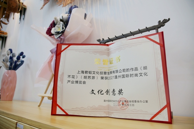 近日,胡苏芬将品牌发布会开到了文博会现场,将传统与现代完美融合,让原本即将失传的非遗文化得以传承,走出产业化、市场化的传承之路。现场与温州本土民营企业瑞立集团签约合作,瑞立集团旗下的万立城商业体,以低廉的租金邀请安亭药斑布品牌入驻商铺。此外,上海君韬文化创意发展有限公司的作品《胡不花》荣获2021温州国际时尚产业博览会文化创意奖。接下来,瑞立酒店还将设立非遗体验基地,引进非遗手作体验、非遗亲子体验课程。